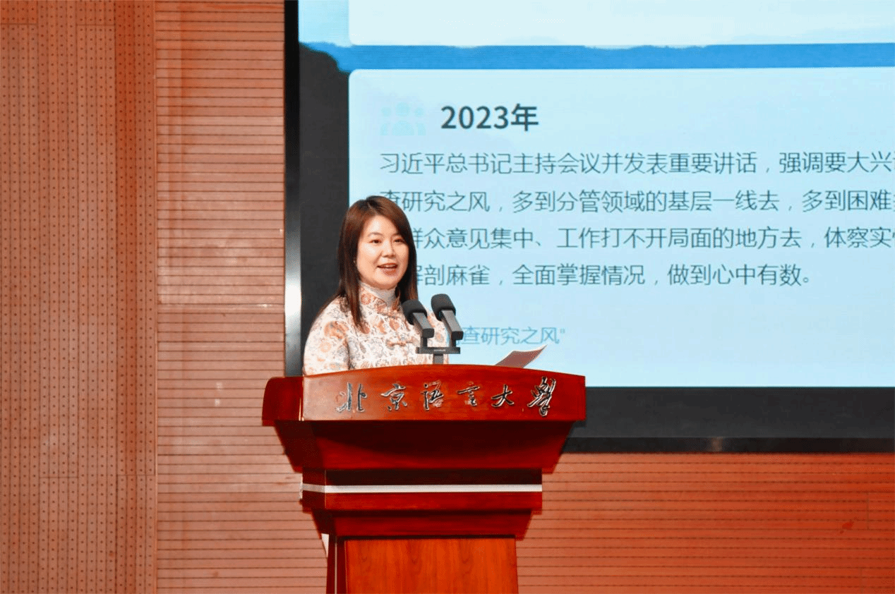 教师代表梁媛携赵佳鑫(中国)、吴思远(巴基斯坦)等学生代表,以《扎根中国田野,读懂时代脉搏:以“寻乌新实践”探寻中国之治》为题,生动汇报了调研团重走“没有调查,就没有发言权”实践起点,探索新时代的“寻乌之变”,解码当代中国治理密码。梁媛老师在汇报中提到,寻乌是毛泽东同志1930年开展著名调查、写下《寻乌调查》的地方,而今我们重访这片红色热土,旨在推动汉学研究从“解释中国”向“参与中国”转变,让青年学子在真实的乡土中把握中国发展的脉搏。调研中,学生们不仅是观察者,更成为参与者——拍摄助农短视频、与老乡保持联系,让学术连接了情感与温度。未来,我们将继续引导青年汉学家扎根中国大地,既做中国故事的倾听者,更做可信、可爱、可敬中国形象的传播者,在文明互鉴中绽放星光。